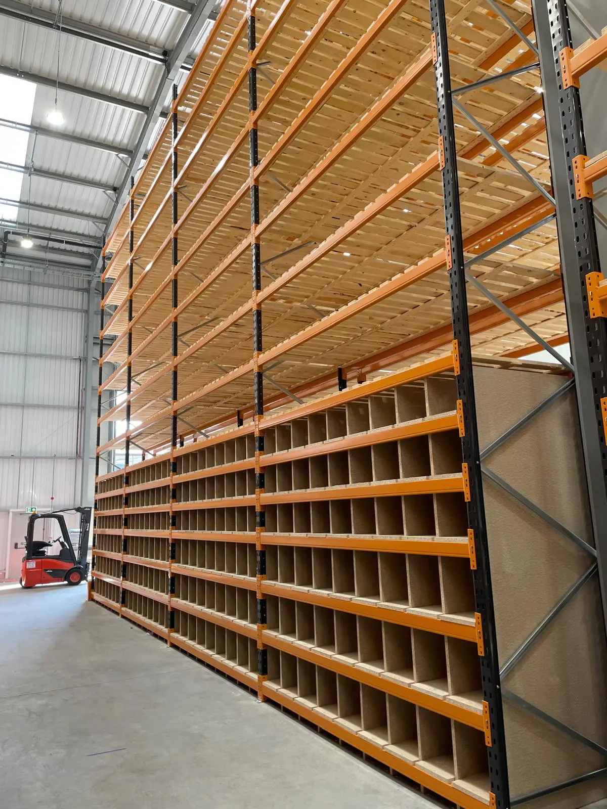 After a comprehensive survey of the building and its existing structures, STS designed a bespoke pallet racking layout to accommodate both bulk and hand-picked storage zones. This included heavy-duty Link 51 XL racking with timber decking and integrated chipboard pigeon-hole shelving for long plastic components.
